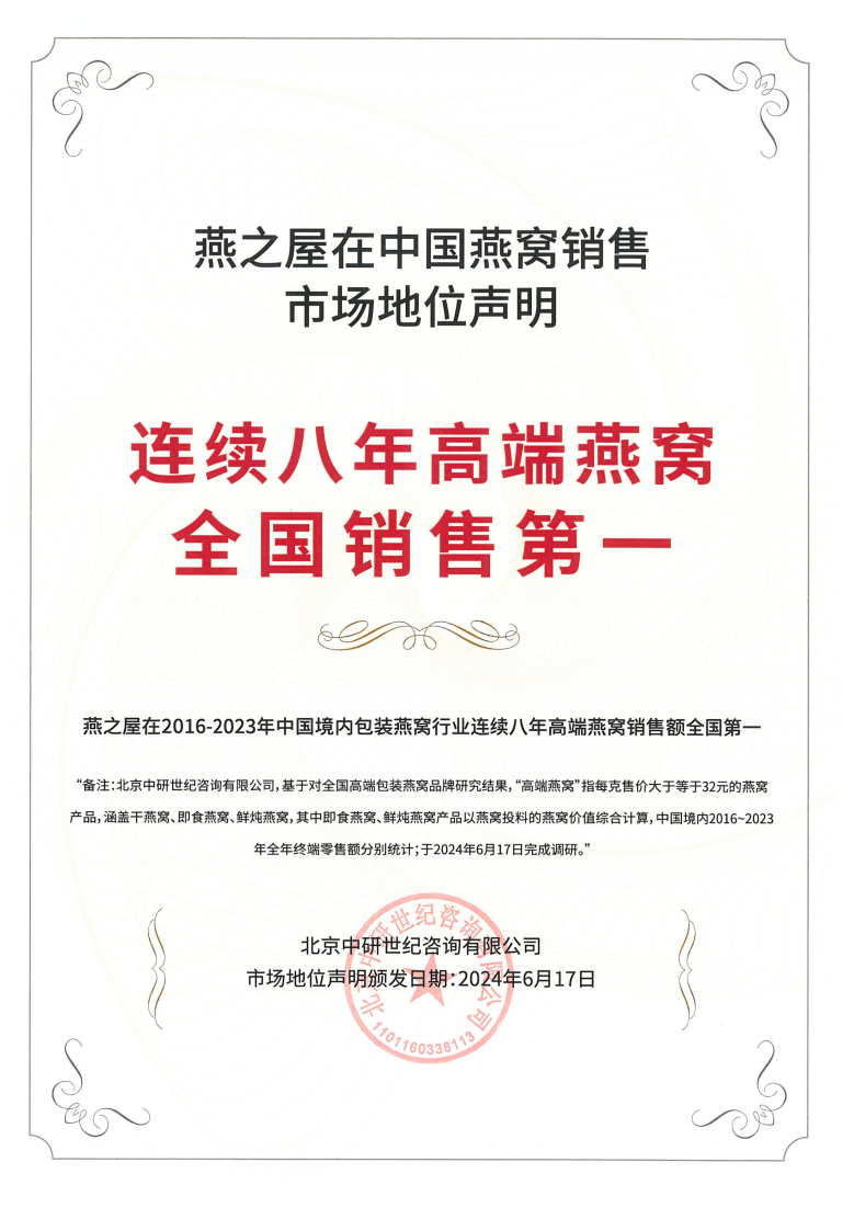 燕之屋26年專(zhuān)注高品質(zhì)燕窩,秉承“一碗好燕窩,滋潤天下人”的初衷,致力于為消費者提供更健康、更營(yíng)養、更美味、更便捷的燕窩滋養,以卓越品質(zhì)塑造良好口碑。2019年,燕之屋正式入駐阿里健康大藥房,借助阿里健康平臺龐大用戶(hù)基礎及數字化能力,精準定位消費群體,拓寬營(yíng)銷(xiāo)渠道,更好地滿(mǎn)足消費者的多元滋養需求,深度鏈接健康產(chǎn)業(yè)市場(chǎng)。截至2023年,燕之屋已連續八年高端燕窩全國銷(xiāo)售第一*(*燕之屋在2016-2023年中國境內包裝燕窩行業(yè)連續八年高端燕窩銷(xiāo)售額全國第一,備注:北京中研世紀咨詢(xún)有限公司,基于對全國高端包裝燕窩品牌研究結果,“高端燕窩”指每克售價(jià)大于32元的燕窩產(chǎn)品,涵蓋干燕窩、即食燕窩、鮮燉燕窩,其中即食燕窩、鮮燉燕窩產(chǎn)品以燕窩投料的燕窩價(jià)值綜合計算,中國境內2016-2023年全年終端零售額分別統計;于2024年6月17日完成調研),并于港交所成功上市(股票代碼:01497.HK),其不僅是燕窩行業(yè)“領(lǐng)頭燕”,也是健康產(chǎn)業(yè)的一匹黑馬,奮勇前進(jìn),勢不可擋,展現蓬勃力量。