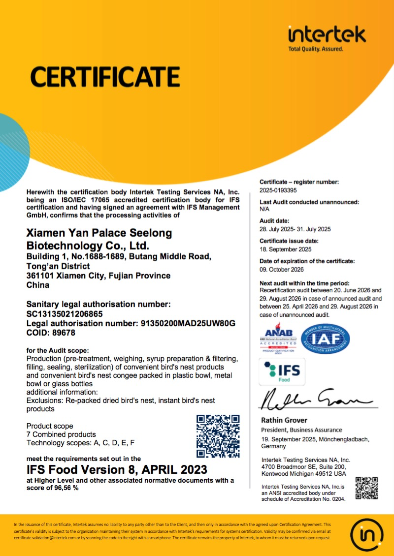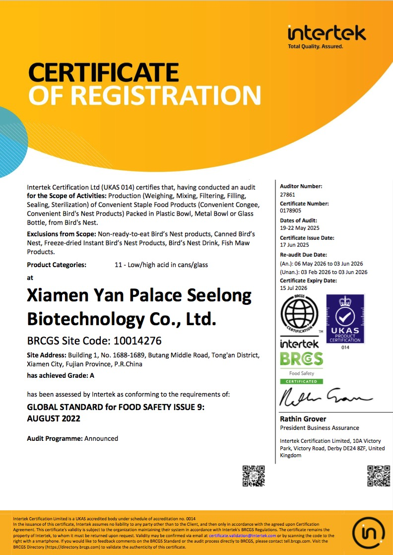隨著(zhù)“健康中國”戰略的深入推進(jìn),健康產(chǎn)業(yè)迎來(lái)前所未有的發(fā)展機遇。燕之屋深耕燕窩行業(yè),在健康產(chǎn)業(yè)賽道篤定前行,以高品質(zhì)鑄就卓越品牌,成為中國乃至全球燕窩行業(yè)率先獲得BRC食品安全全球標準、IFS國際食品標準雙重認證的燕窩品牌④ 。這些國際認可的取得,彰顯了燕之屋對品質(zhì)的堅守,也為中國滋補品贏(yíng)得了國際聲譽(yù)。